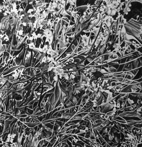 A rider since childhood, and in adult life the owner of horses, equine paintings have regularly been produced and there have also been a number of conventional (and some less conventional) landscapes. Flowers, however, remain her primary interest. Whilst her most recent work has mainly concentrated on flowers and plants in gardens and hedgerows, she has also regularly produced drawings and paintings of potted plants and cut flowers in vases.
