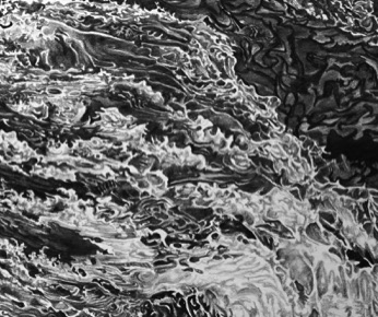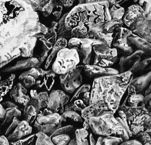 An emphasis on pattern is evident in much of her work. A drawing of a dead sheep on a beach in Anglesey, from 1979, is particularly notable for the precise rendering of the pattern, both of and on the stones and pebbles. This interest in pattern was also evident in her later drawings and paintings of the swirling and flowing patterns in water and in her drawings and paintings of undergrowth.
