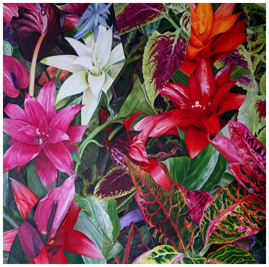 By 2012, when she exhibited work as part of Macclesfield’s Barnaby Festival, Pat had begun to produce a series of highly detailed paintings of flowers and plants. Derived from her own photographs of gardens, she developed a technique of cutting up and combining the images to create vibrant and dynamic pictures.